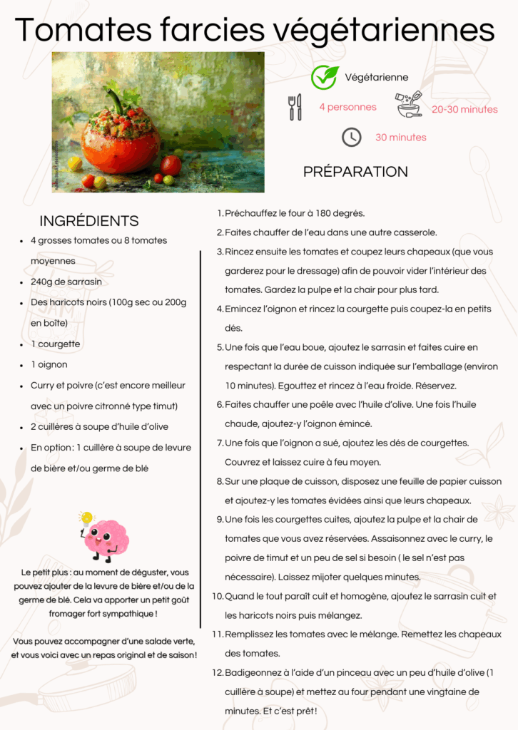 Tomates farcies végétariennes Une version végétarienne des tomates farcies, riche en fibres et en protéines, parfaite pour un repas équilibré ...